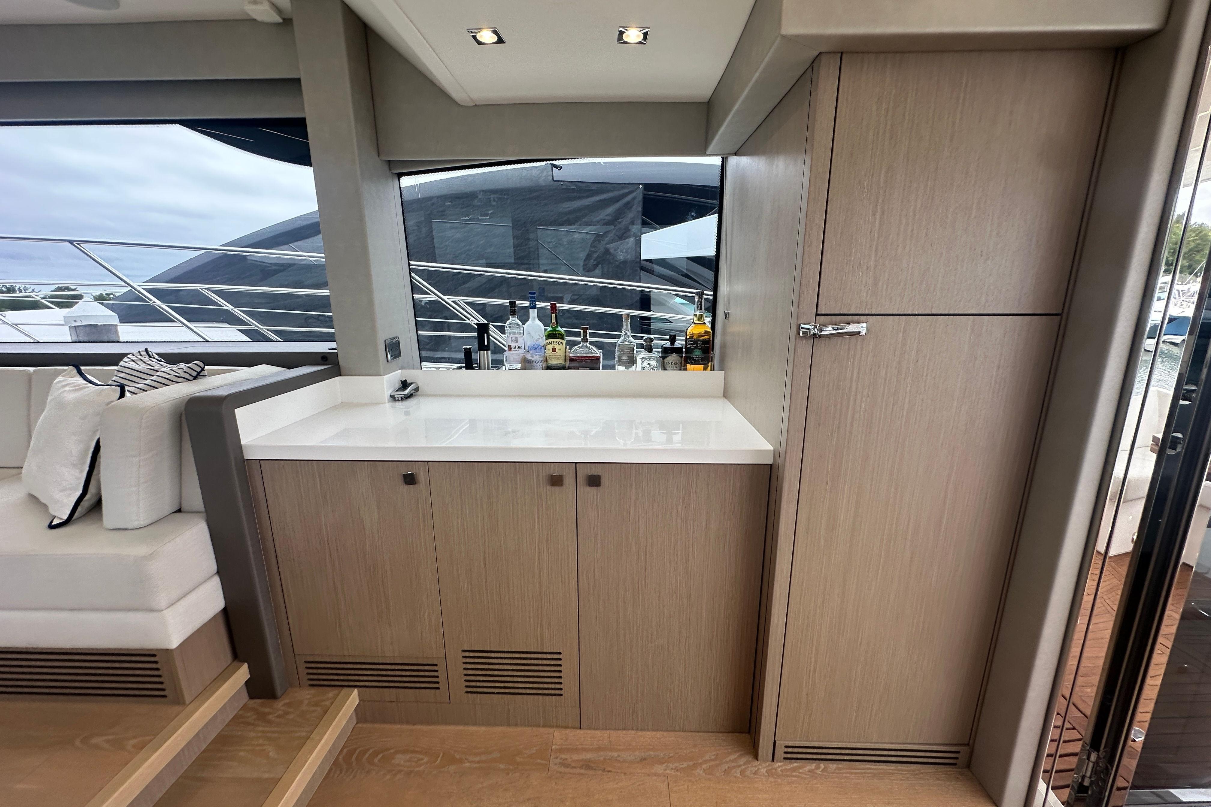 The sought-after Beach Club Package transforms the aft deck into an entertainer’s paradise with a marine grill, fold-down seating, and an overhead shower. Teak decking on the flybridge and cockpit adds a timeless, elegant finish to the outdoor living spaces. Inside, premium finishes such as Cadorin hardwood flooring and Silver Oak satin cabinetry pair with Samsung and LG AV systems for ultimate onboard comfort.